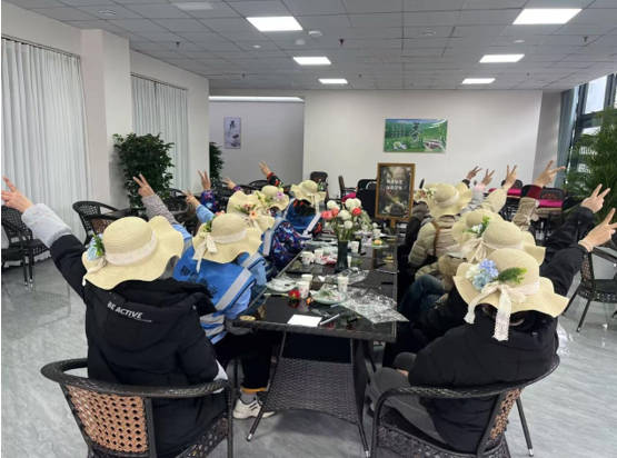 上午11時(shí),創(chuàng)意手作環(huán)節(jié)在藍(lán)鼎茶坊開(kāi)展,F(xiàn)場(chǎng)備有純色草帽及永生花、絲帶等裝飾材料,女員工們精心挑選花材,巧妙構(gòu)思造型:有的將向日葵與康乃馨錯(cuò)落點(diǎn)綴成環(huán)形花冠,有的用絲帶編織出立體蝴蝶結(jié)裝飾。大家邊制作邊交流配色心得,互相挑選合適的花朵、協(xié)助粘貼花材。“通過(guò)團(tuán)隊(duì)協(xié)作完成作品,讓我們感受到了自己動(dòng)手創(chuàng)造帶來(lái)的快樂(lè)。”一位參與者如是說(shuō)。