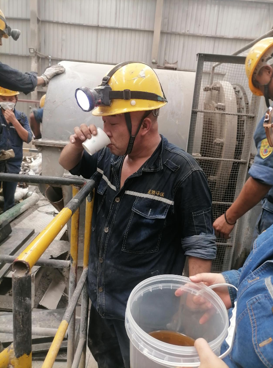 7月17日15時,西昌市氣溫已升至35 ℃。在生產(chǎn)區(qū)球磨機檢修平臺,機器轟鳴、焊花四濺。西昌藍(lán)鼎環(huán)保人力行政部李小方提著保溫桶,沿著滾燙的鋼梯來到作業(yè)點,為正在揮汗檢修的員工送上剛從冰柜取出的“定制涼茶”。