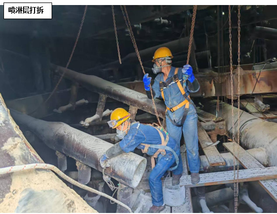 維修方案確定后,攀藍(lán)鼎立即開始著手噴淋管道采購預(yù)制工作,考慮到目前燒結(jié)產(chǎn)能不飽和,系統(tǒng)多處停機(jī)的因素,決定預(yù)制管道到廠后由檢修進(jìn)行拆除及更換,只保留技術(shù)性要求較高的玻鋼粘接由專業(yè)施工人員來完成。7月24日,在材料到廠后,檢修立即開始在塔內(nèi)布置安全措施,并進(jìn)行噴淋層打拆工作,打拆過程中檢修對(duì)切下的三通支管進(jìn)行仔細(xì)甄別,磨損嚴(yán)重的進(jìn)行報(bào)廢處理,還具備使用價(jià)值的作為備件歸置,以確保物盡其用。打拆完畢后,檢修隨即進(jìn)行管道吊裝及內(nèi)部組裝配管工作,配管完成后防腐單位開始進(jìn)場(chǎng)作業(yè),在此過程中檢修全程安排人員進(jìn)行組對(duì)及工程質(zhì)量監(jiān)督工作,并及時(shí)撤場(chǎng)收尾。